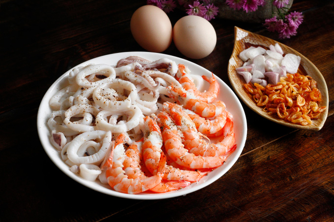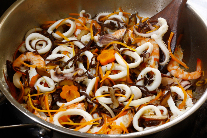 Xào nhân: Phi thơm hành khô, cho tôm và mực vào xào nhanh tay. Sau đó cho mộc nhĩ, nấm hương, cà rốt vào xào chín tới. Thêm hành tây, giá đỗ đảo nhanh hơi chín tới tầm 60 - 70%.
