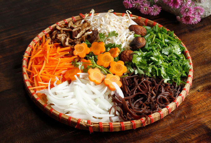 Các topping kèm theo khác (tùy chọn theo sở thích và theo mùa) như hành tây thái múi cau nhỏ, cà rốt thái sợi; nấm hương, mộc nhĩ ngâm nở rửa sạch, thái sợi; giá đỗ rửa sạch để ráo nước. Hành, mùi rửa sạch cắt khúc.