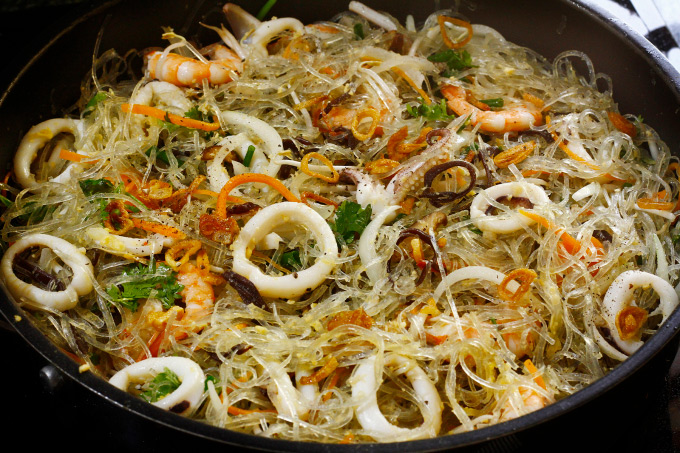 Trút miến đã xào vào chảo tôm, mực, rau củ rồi trộn đều cho hòa quyện. Nêm nếm lại gia vị cho vừa miệng, rắc chút hạt tiêu, hành lá và tắt bếp, gắp ra đĩa, rắc thêm chút hành phi và thưởng thức nóng.