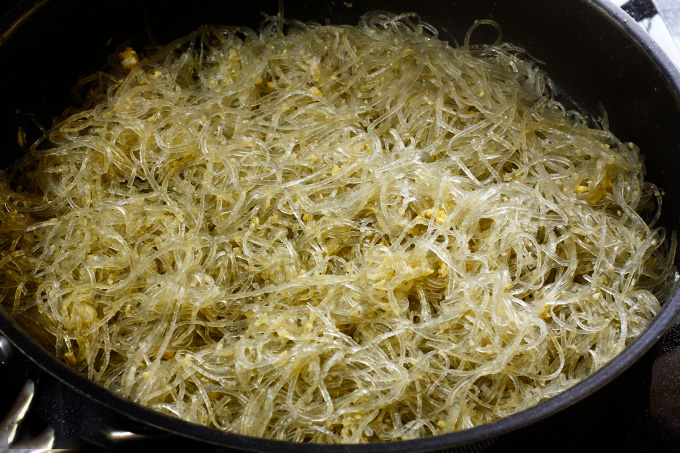Miến sau khi ngâm vớt ra để rổ thưa cho ráo nước rồi cắt đoạn vừa ăn. Sau đó cho vào âu, đập hai quả trứng gà vào, trộn đều cùng với miến.